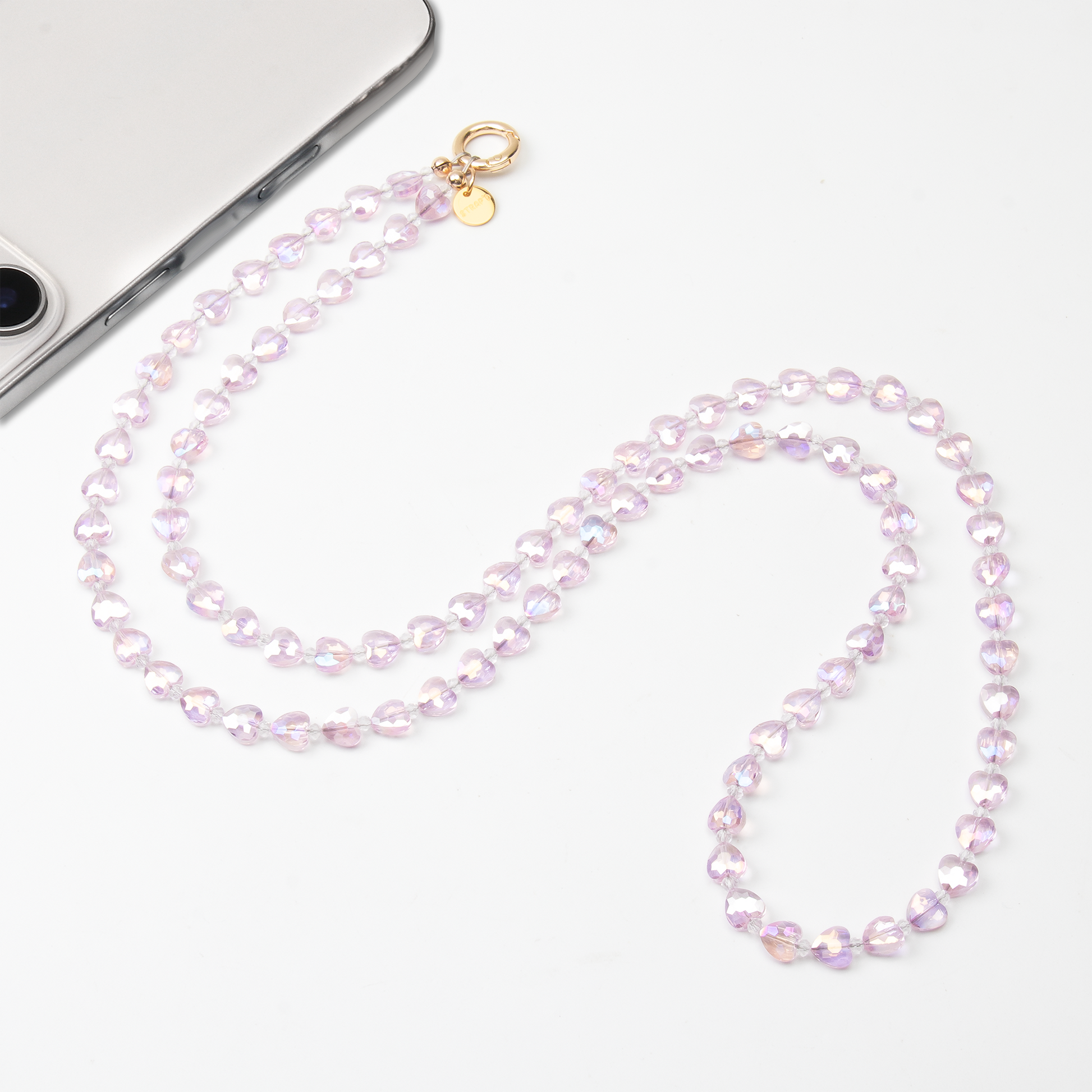 Designed for those who adore love and trend-driven style. This long crossbody strap features acrylic glass beads shaped like hearts, complemented by stainless wire and gold hardware. The product includes a clear adaptor for easy connection to your phone.